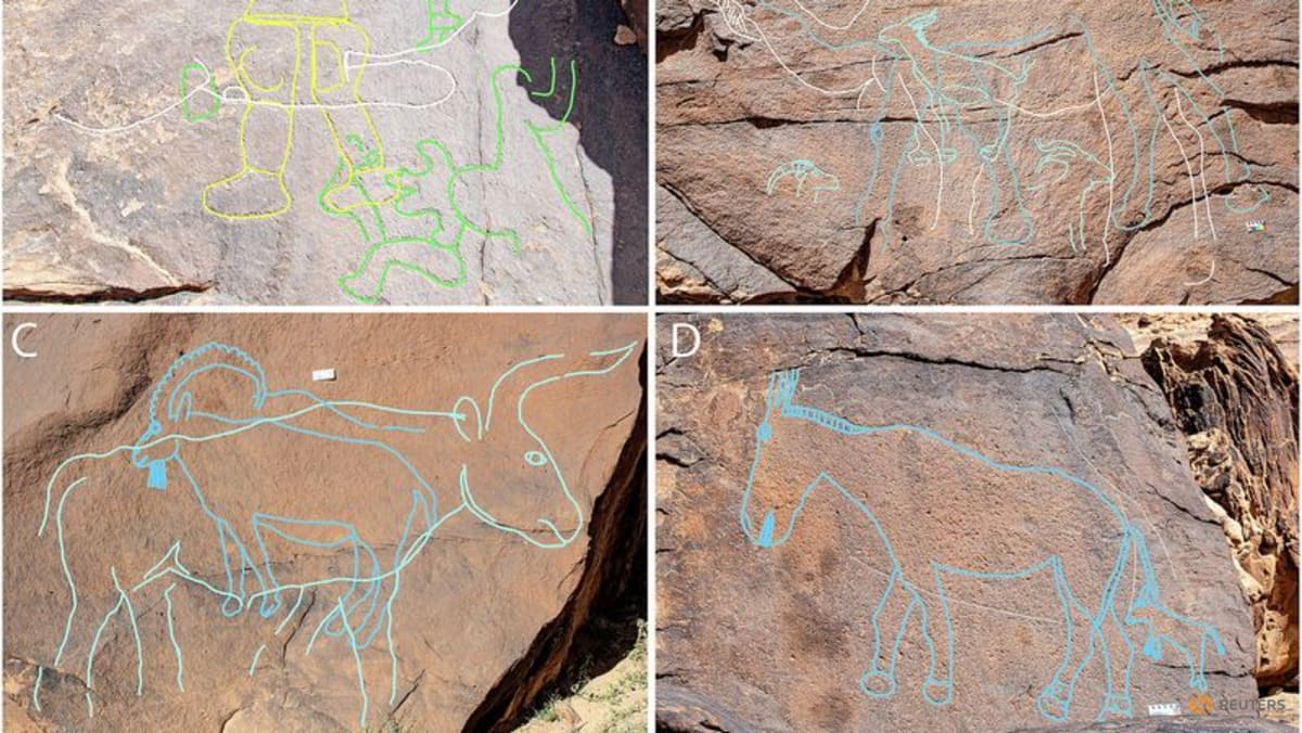 Researchers said the monumental rock art was found south of the Nefud desert of northern Saudi Arabia at locales spanning a distance of about 20 miles (30 km) in mountainous terrain.
