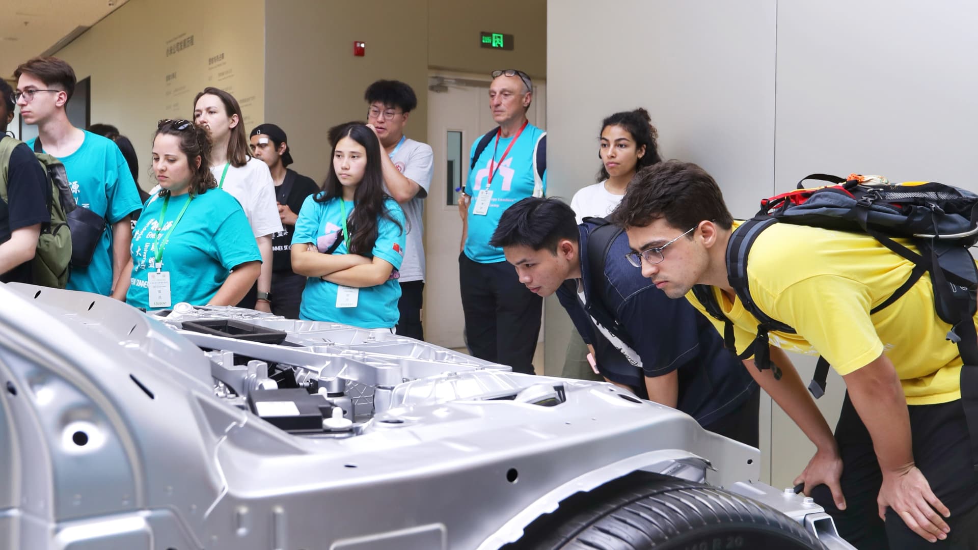 BEIJING, CHINA – JUNE 30: Foreign students view Modena platform while visiting Xiaomi Auto Super Factory on June 30, 2025 in Beijing, China.