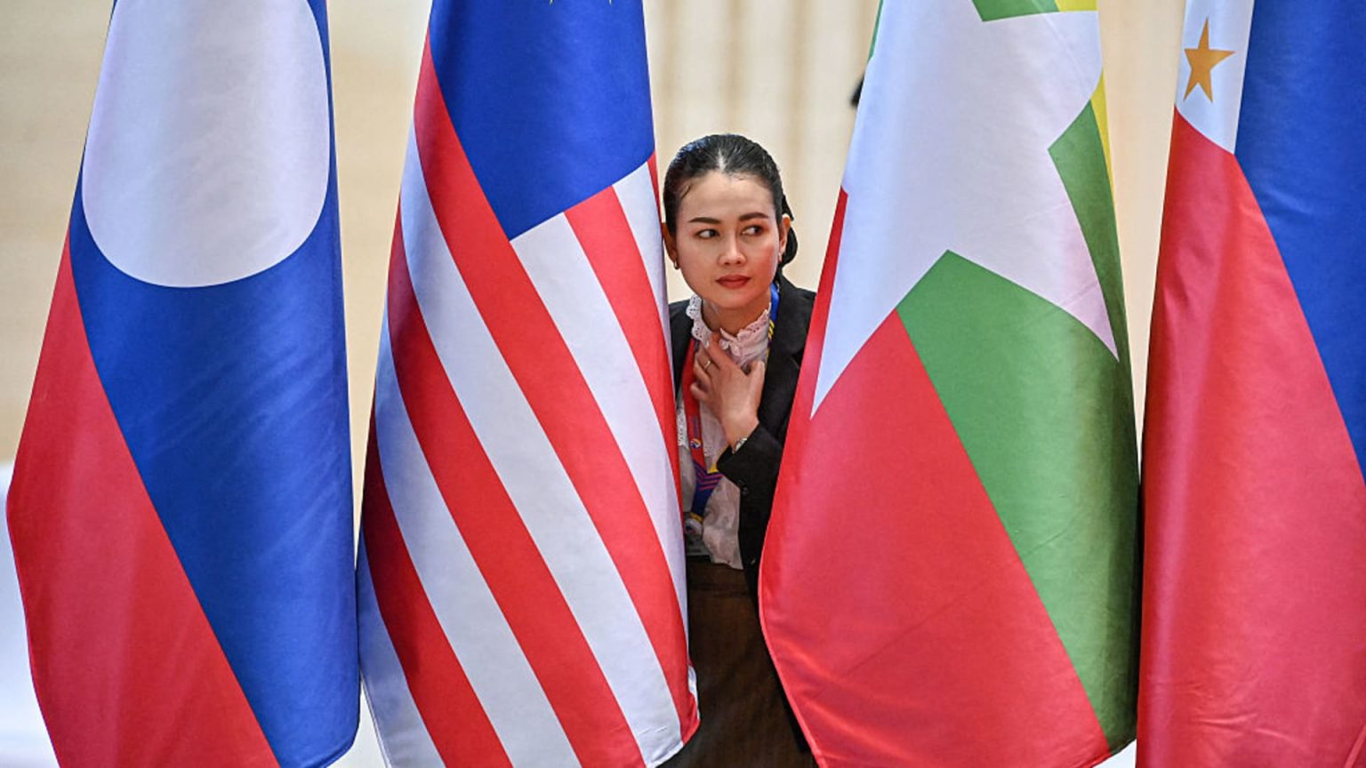 Several flags including that of the United States, Cambodia, the European Union, Japan and ASEAN are seen outside a building in Krong Siem Reap, Cambodia, on July 27, 2025.