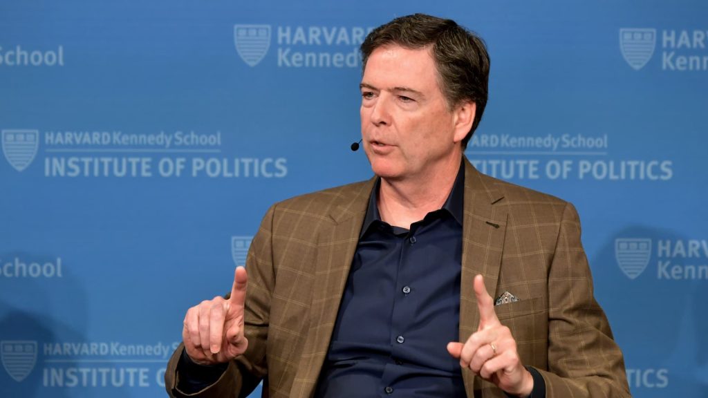 Former FBI Director James Comey speaks at Harvard Kennedy School with Harvard’s Eric Rosenbach on February 24, 2020 in Boston, Massachusetts.