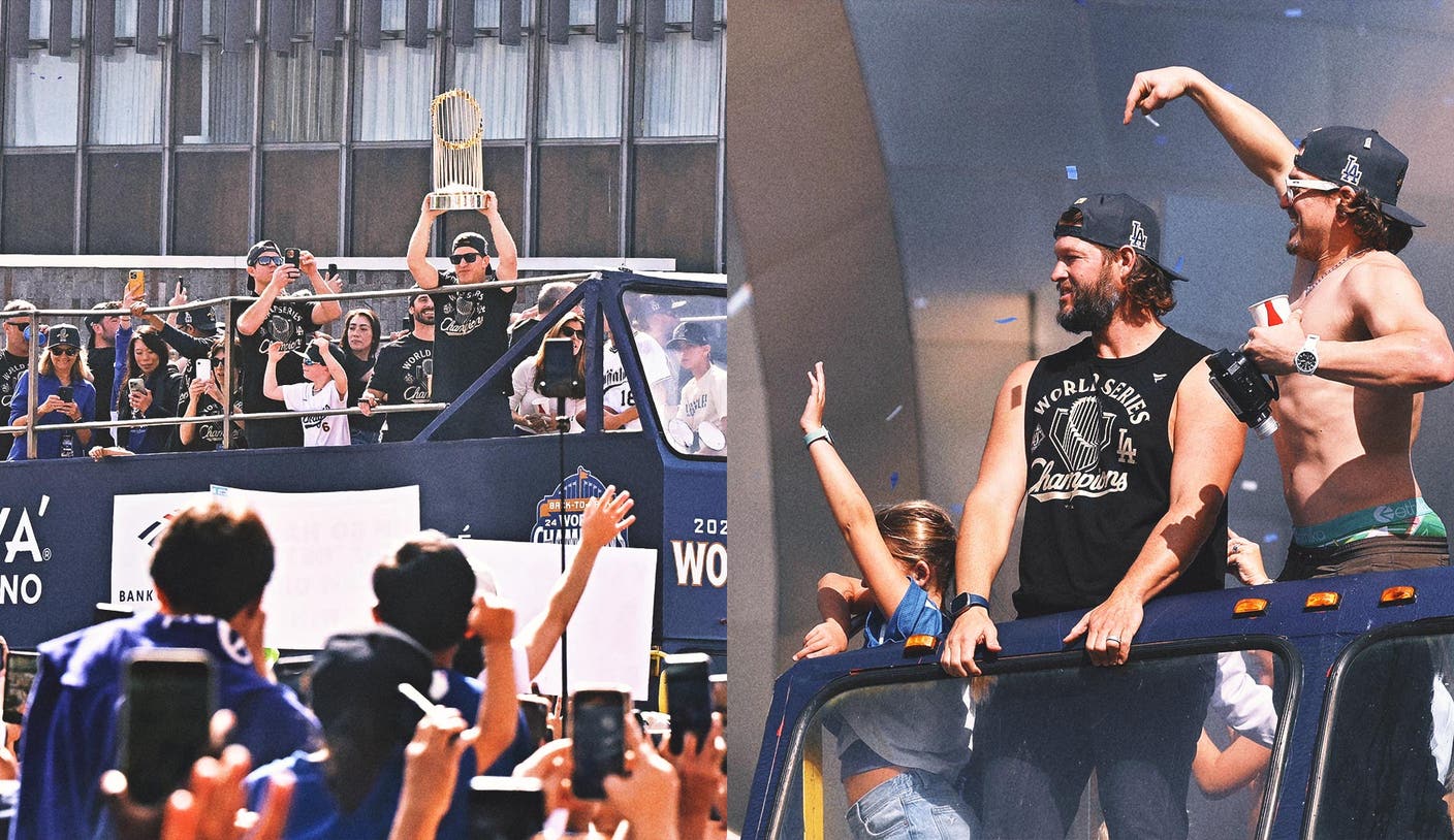 Blue-and-white confetti blew from a truck rolling between the buses, which were filled with family members of the players, including newly retired Clayton Kershaw and his four children.