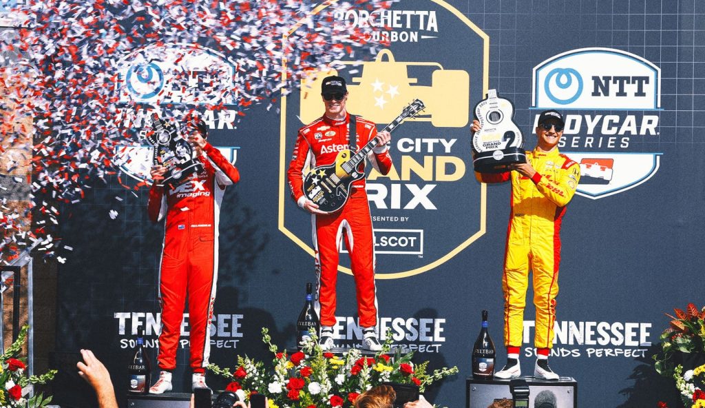 Josef Newgarden (center) celebrates on the podium with Scott McLaughlin and Alex Palou after winning Nashville