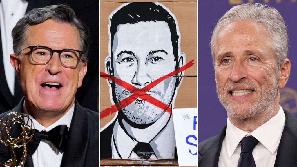 US talk show host Stephen Colbert has condemned the cancellation of fellow late-night star Jimmy Kimmel as a “blatant assault on freedom of speech”.