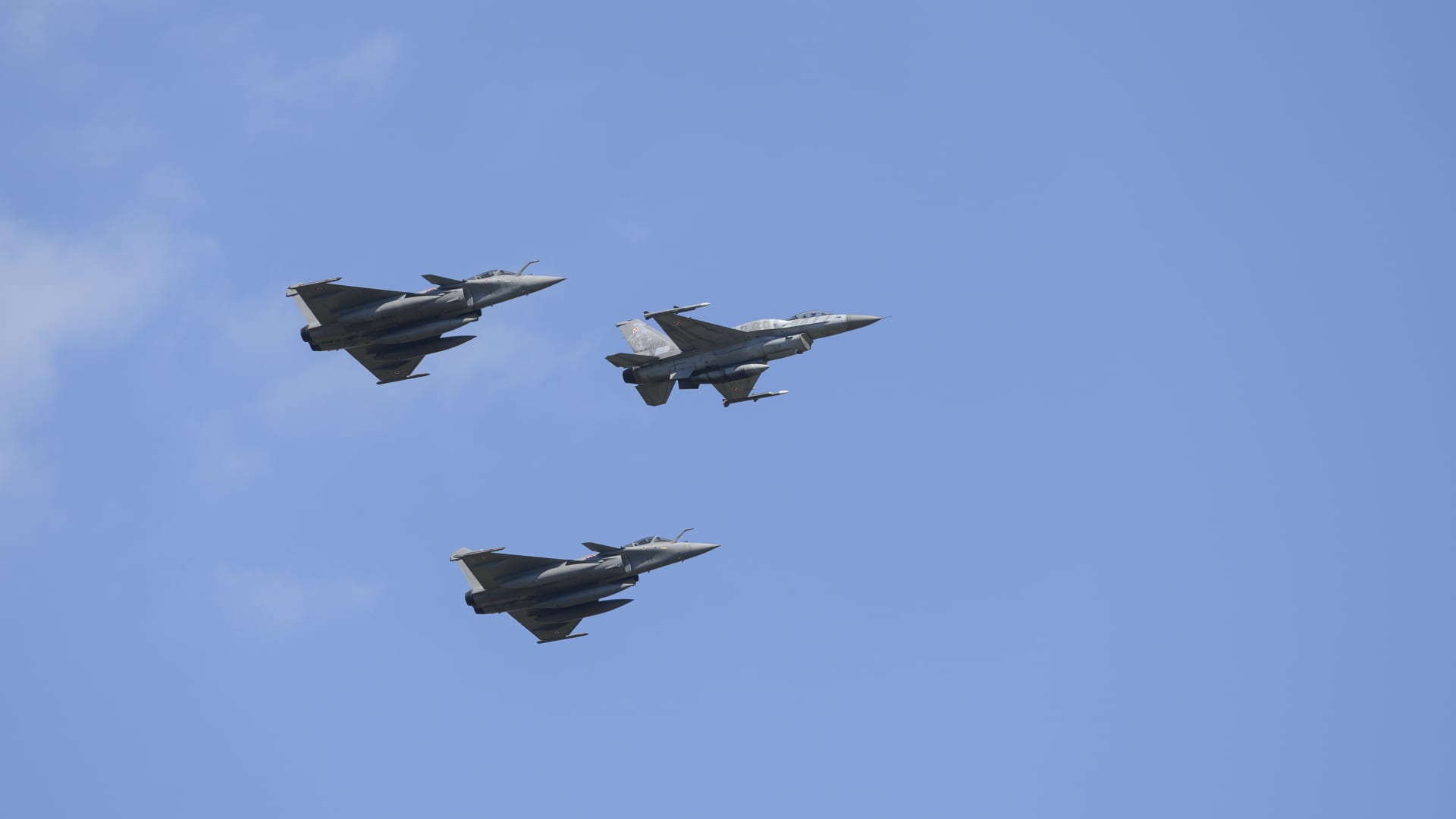 A Polish air force F-16 is flanked on either side by Dassault Rafale fighter jets as they perform a flyover during the National Army Day military parade in Warsaw, Poland, on August 15, 2025.