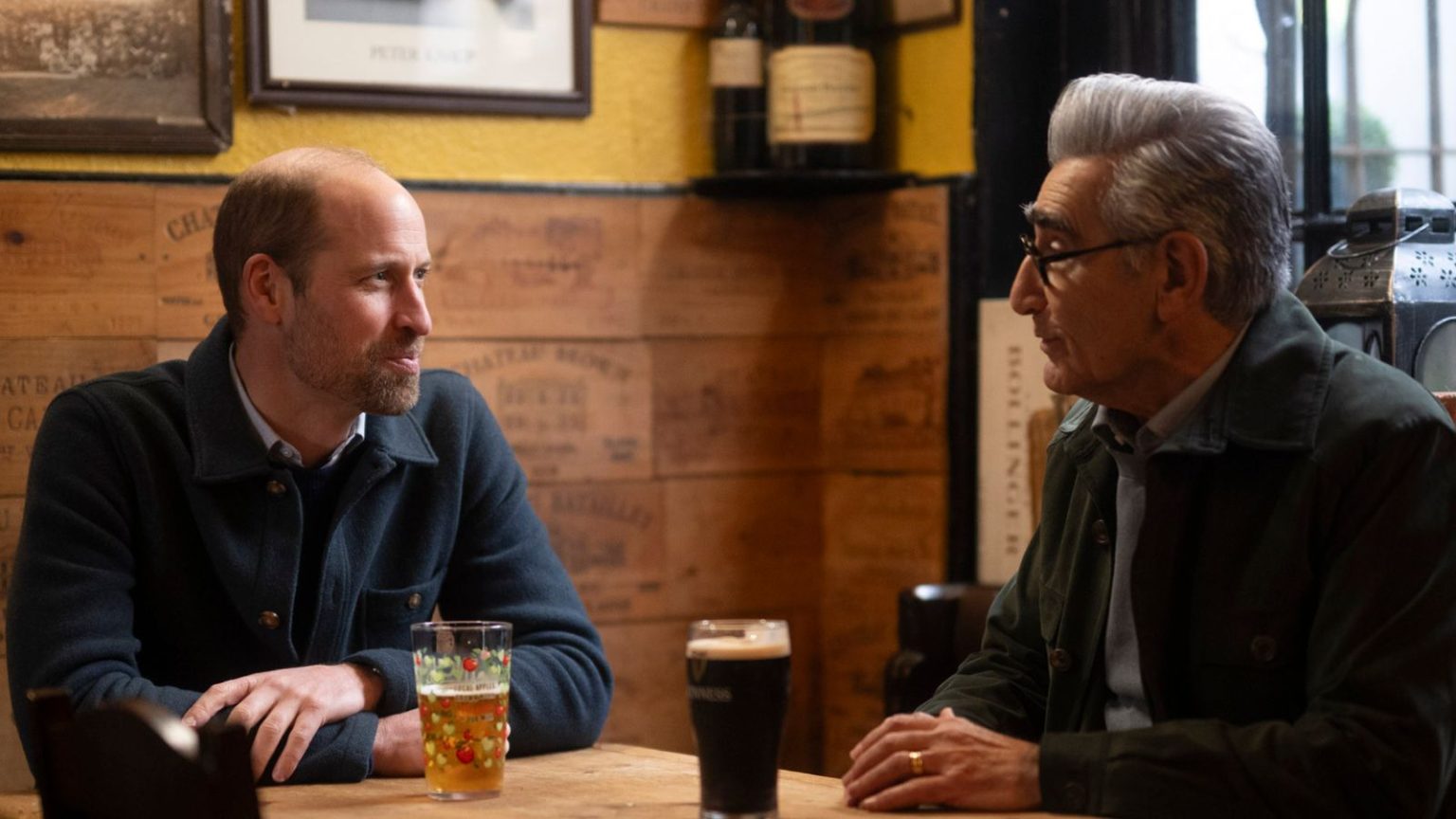 The pair were catching up over a pint in a pub as part of Apple TV+ series The Reluctant Traveler With Eugene Levy, which will air next month.
