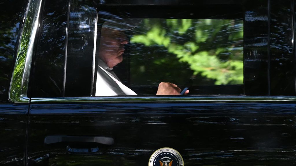 US President Donald Trump checks his phone as he departs from Trump National golf course in Sterling, Virginia on August 31, 2025, en route to the White House.